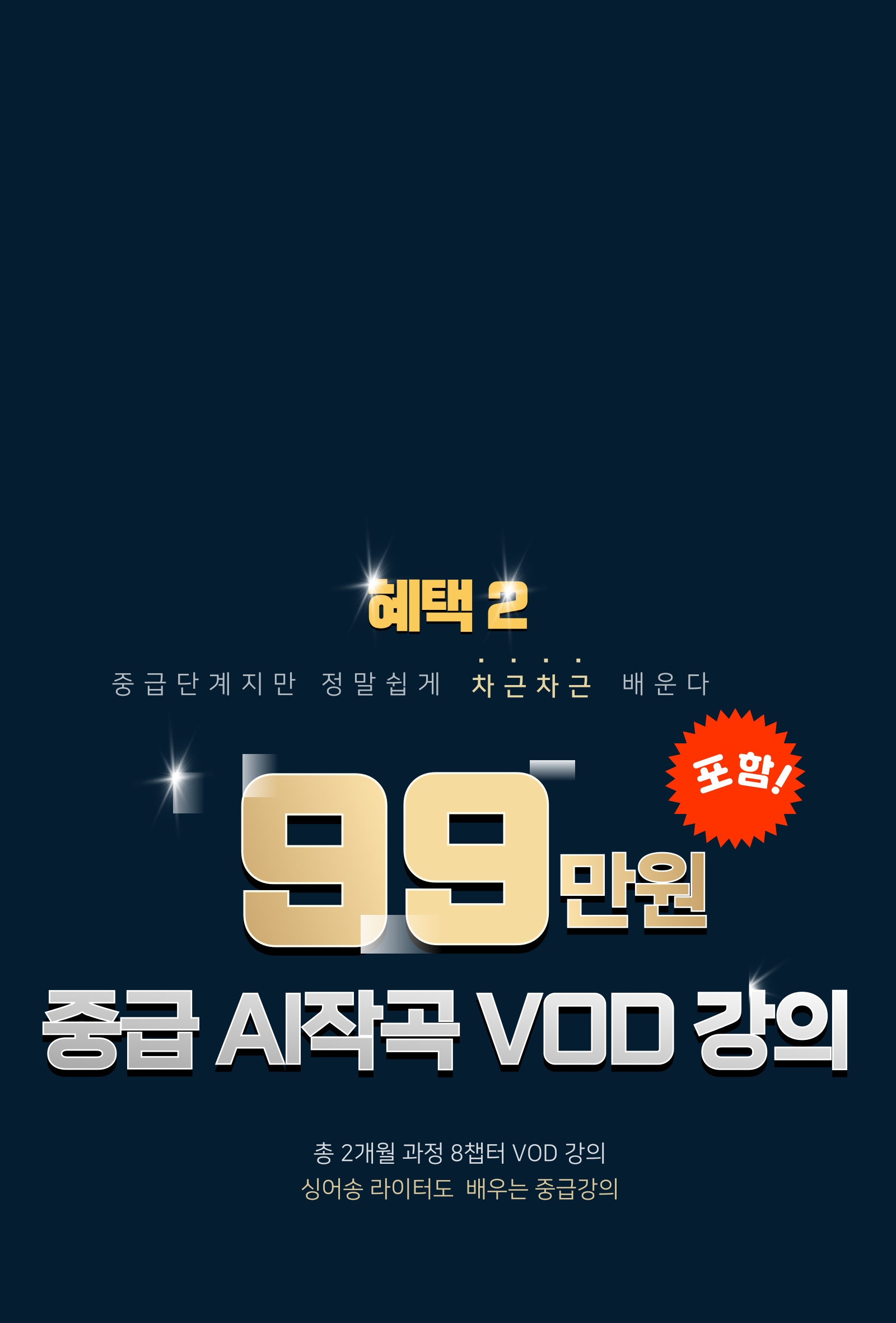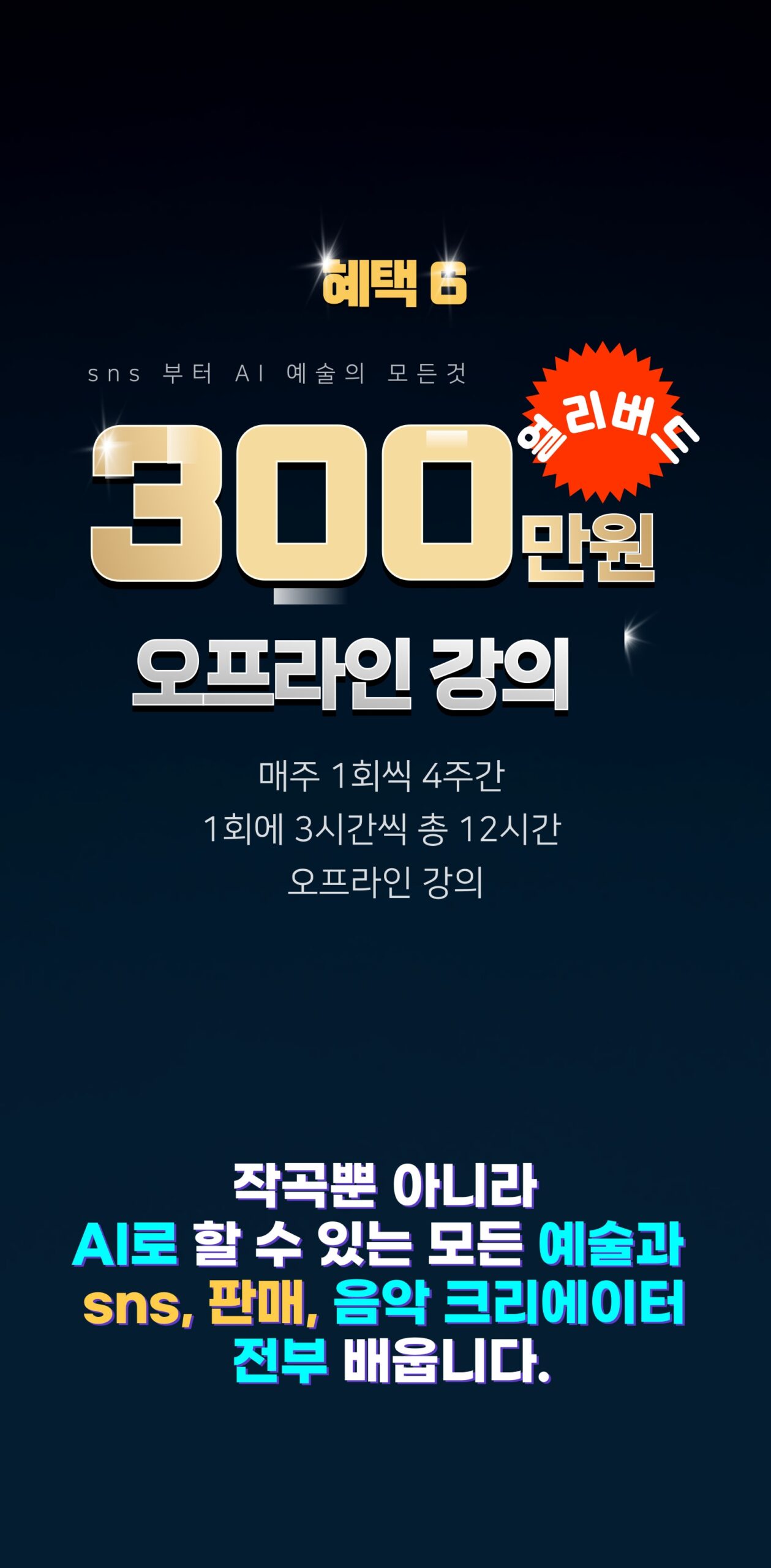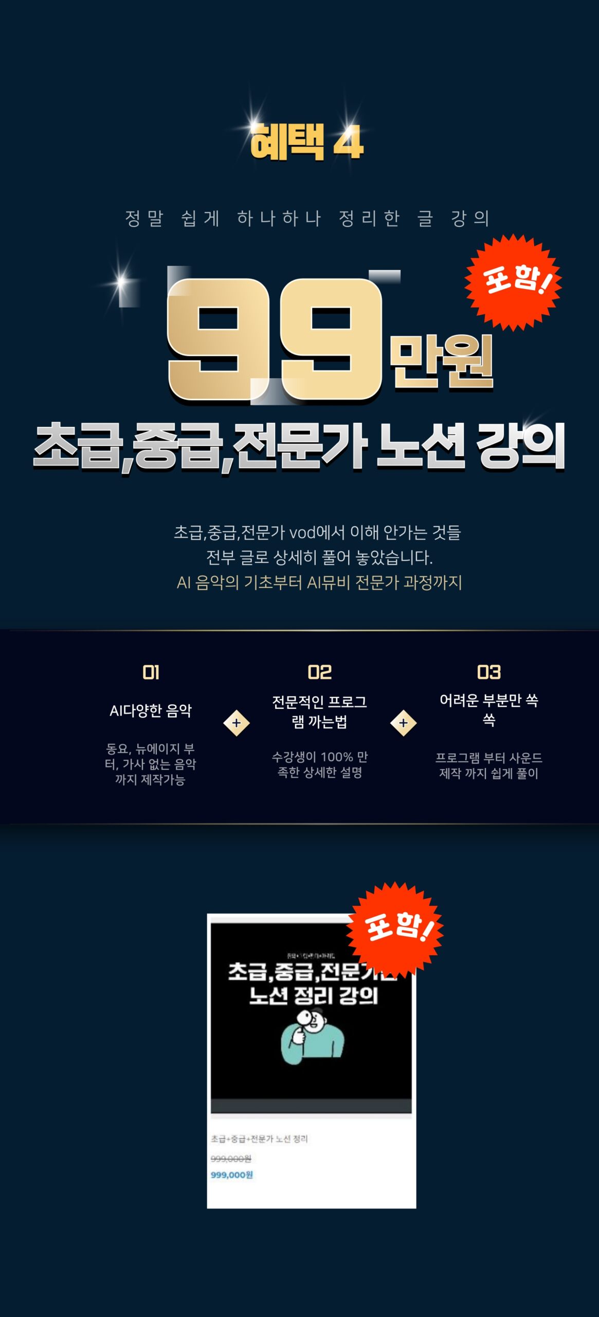 AI작곡 뿐만 아니라 음악을 판매하는 모든 루트를 배웁니다. 뿐만 아니라 직접 판매 이외에도 AI작곡으로 수익화 할 수 있는 모든 경로를 배웁니다. 제이린쌤 커뮤니티 형성으로 함께 홍보하는 혜택을 받습니다. 본 상품은 모든 vod를 수강할 수 있는 울트라등급 아이디 업데이트 이후엔 환불이 불가능함을 고지합니다.