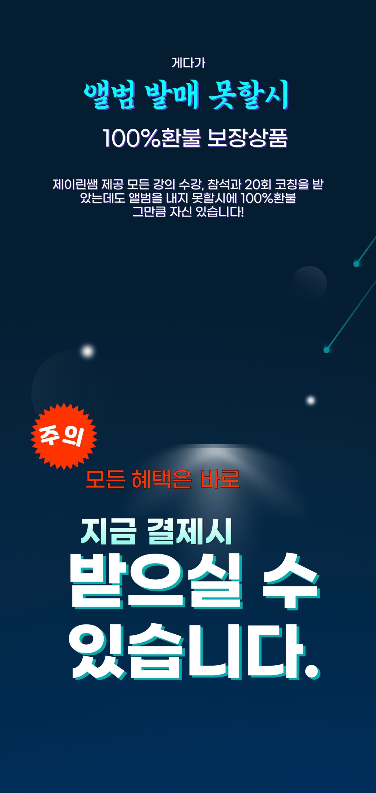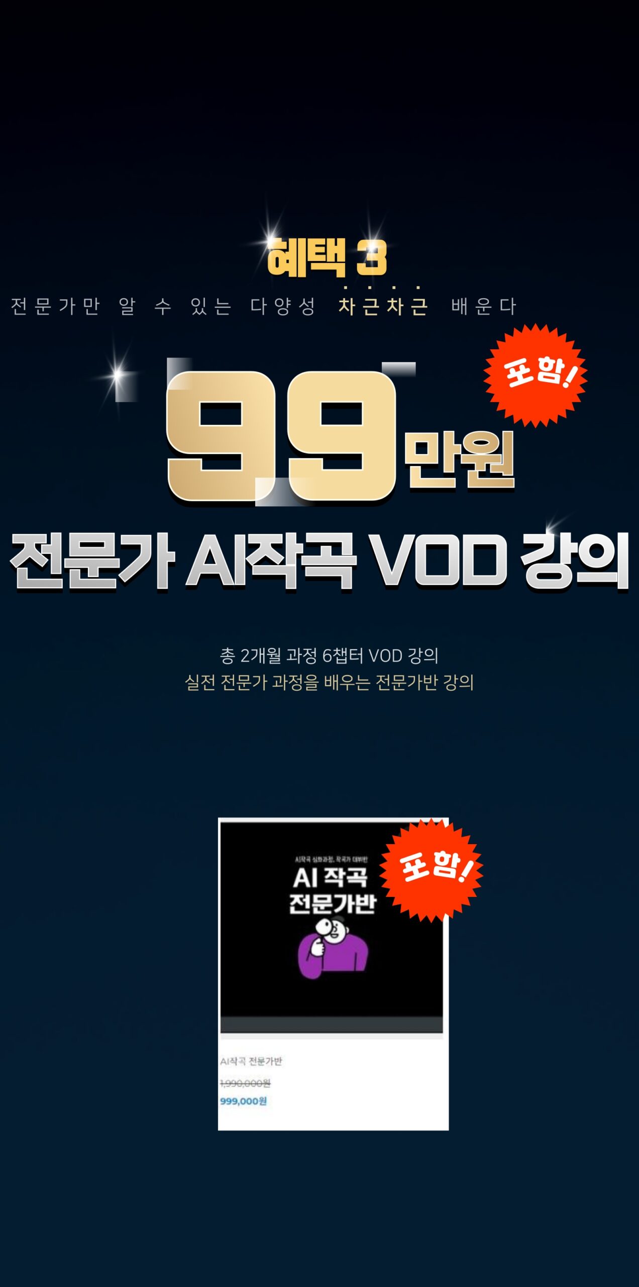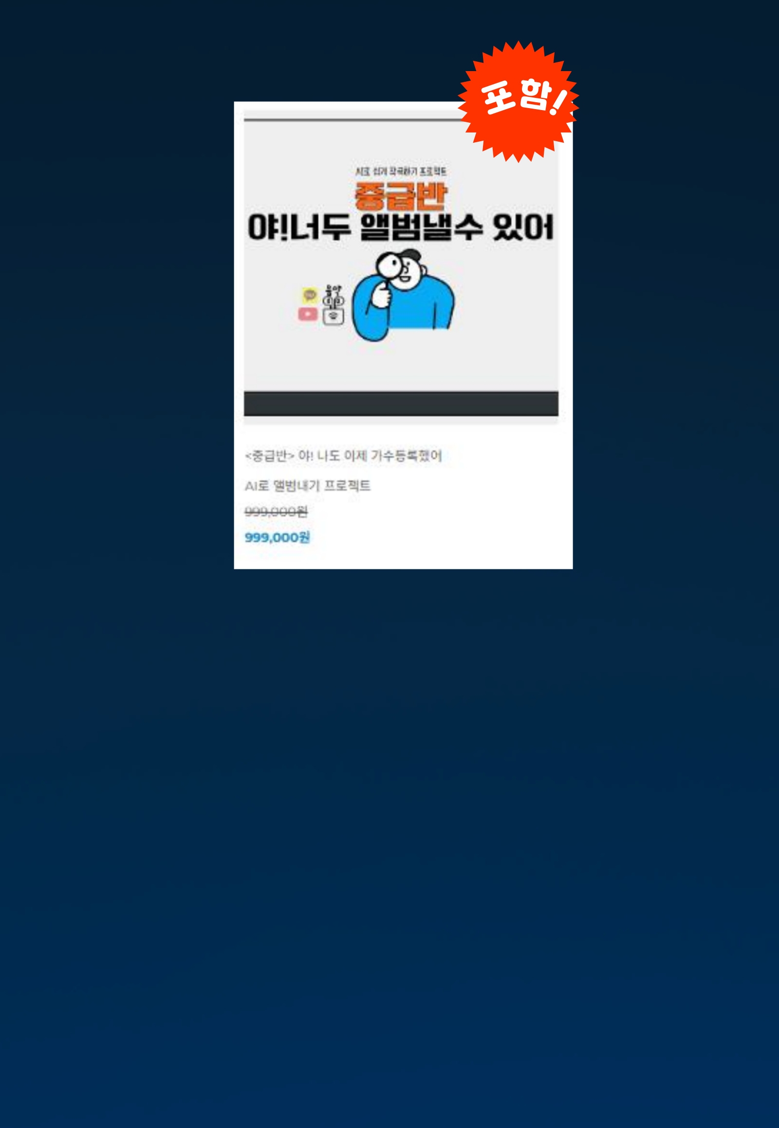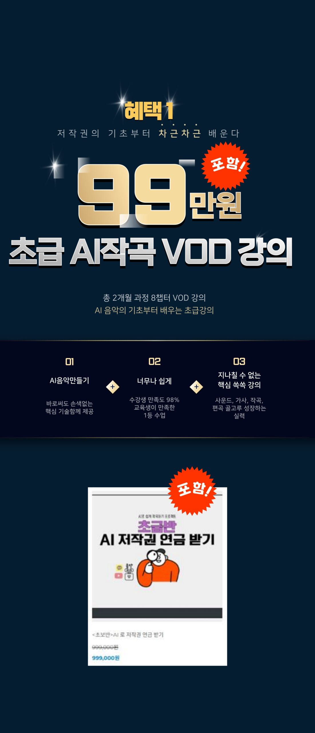 AI작곡 뿐만 아니라 음악을 판매하는 모든 루트를 배웁니다. 뿐만 아니라 직접 판매 이외에도 AI작곡으로 수익화 할 수 있는 모든 경로를 배웁니다. 제이린쌤 커뮤니티 형성으로 함께 홍보하는 혜택을 받습니다. 본 상품은 모든 vod를 수강할 수 있는 울트라등급 아이디 업데이트 이후엔 환불이 불가능함을 고지합니다.